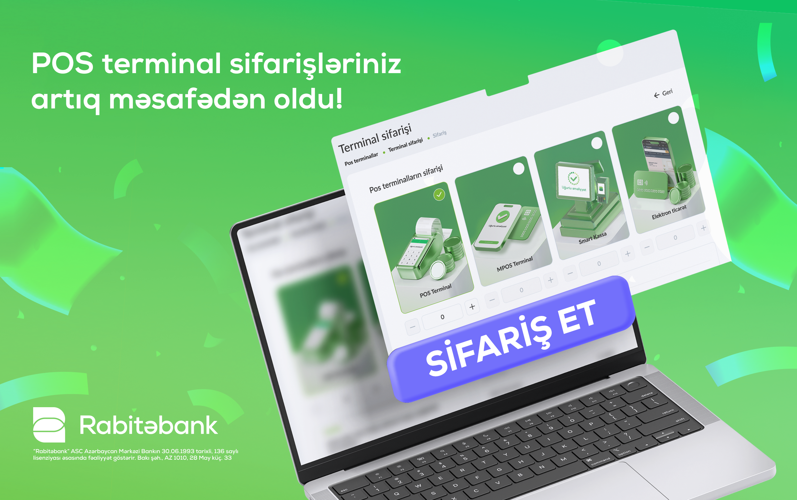 Rabitəbank müştərilərinin rahatlığı üçün POS terminal, Elektron ticarət, Smart Kassa və Mobil POS xidmətlərinin məsafədən sifarişlərini təqdim edir.