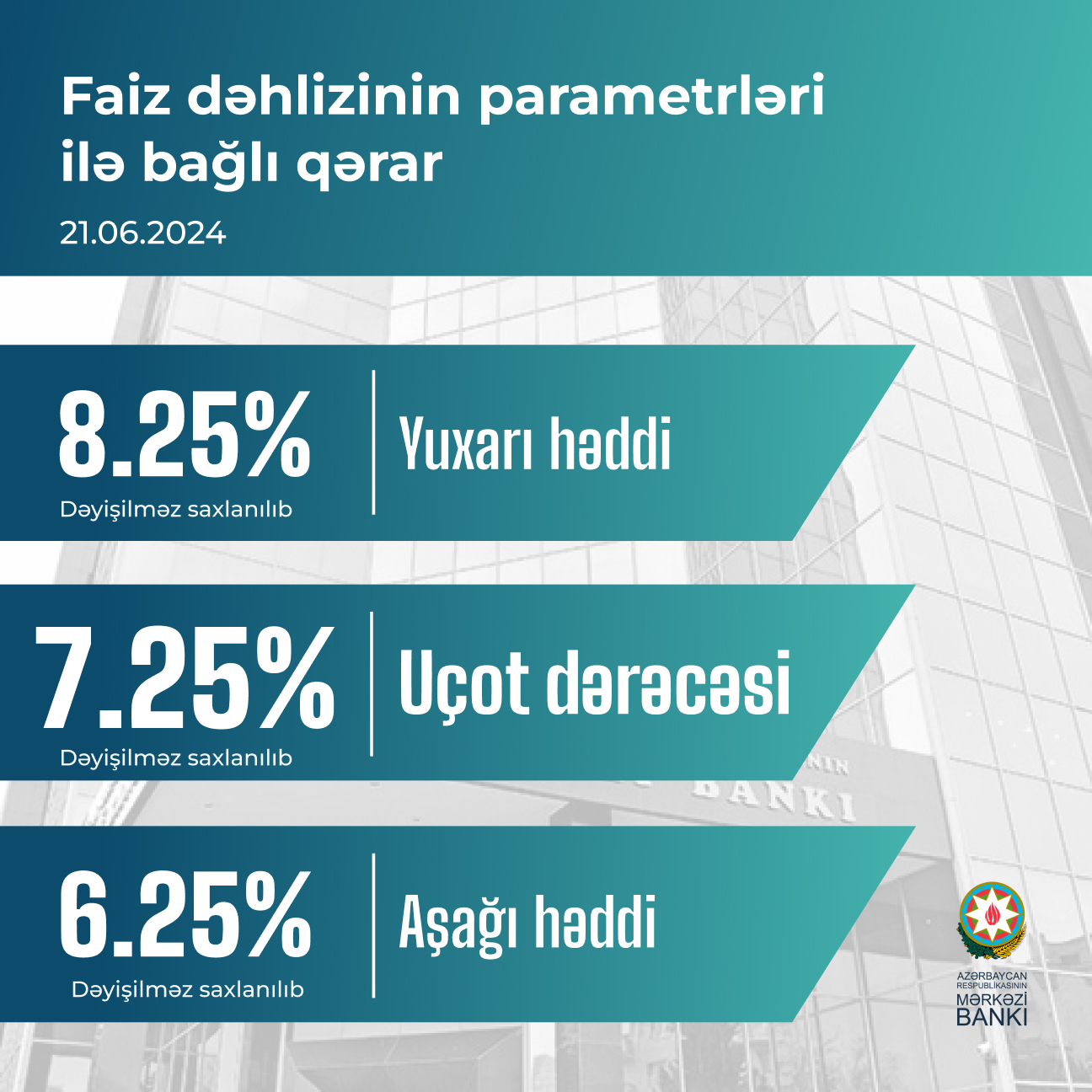 Azərbaycan Respublikası Mərkəzi Bankının İdarə Heyətinin qərarı ilə uçot dərəcəsi 7.25%, faiz dəhlizinin aşağı həddi 6.25%, faiz dəhlizinin yuxarı həddi isə 8.25% səviyyəsində dəyişməz saxlanılıb.