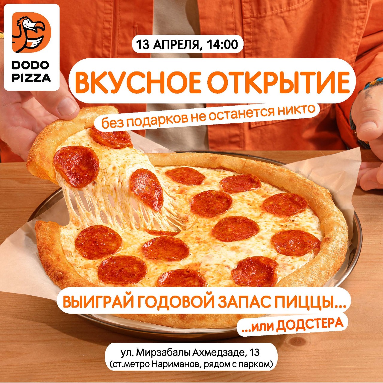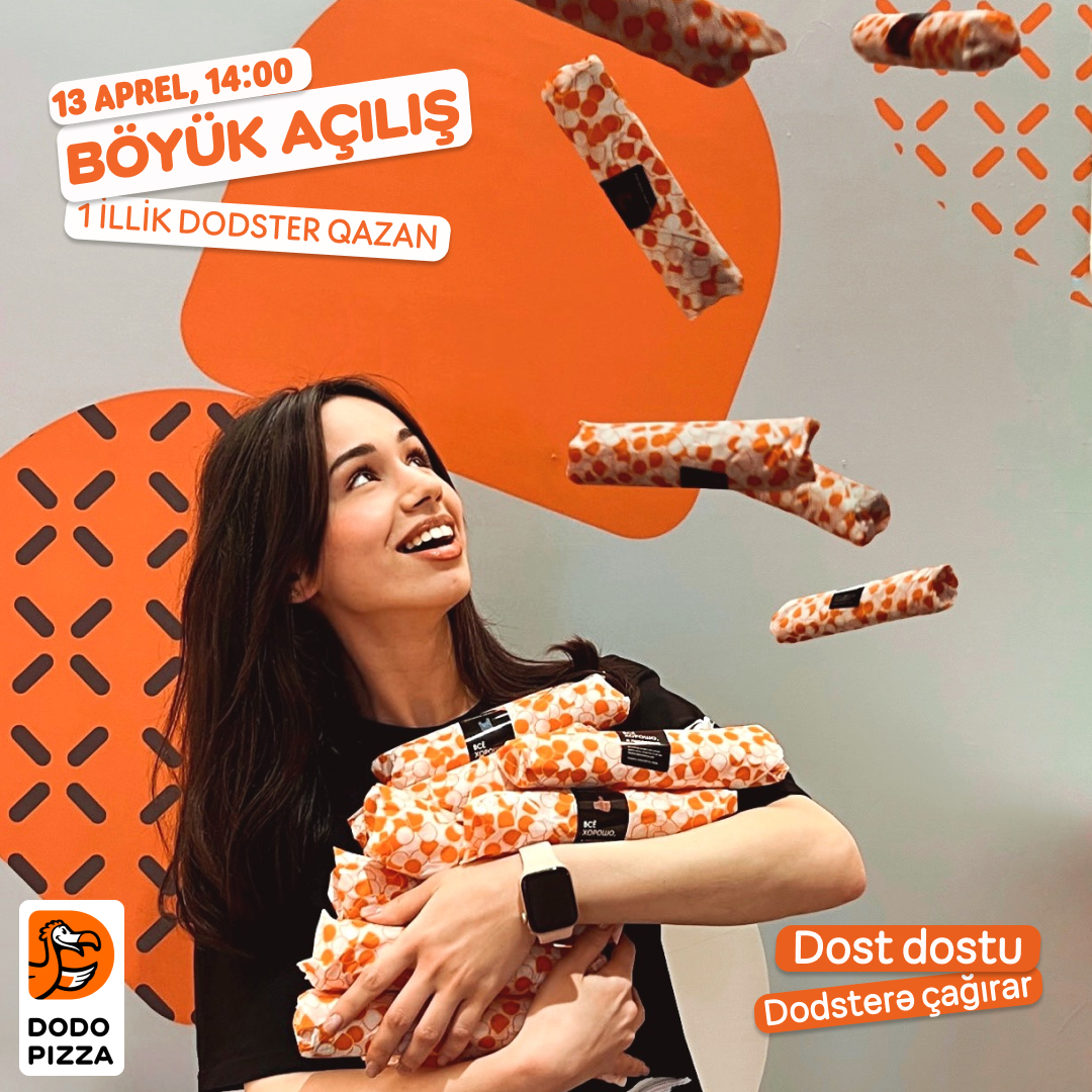 Şənbə günü, aprelin 13-də, Dodo Pizzanın ilk restoranının rəsmi açılışı keçiriləcək. Açılışda musiqi, animatorlar, 100% uduşlu Çərxi-Fələk, müxtəlif müsabiqələr, uşaqlar üçün əyləncə proqramı və 1 illik pulsuz dodster və pizza ehtiyyatı öz sahibini tapaçaq. Gün ərzində bütün müştərilər müsabiqələrdə iştirak etmək və dadlı hədiyyələr qazanmaq imkanı qazanacaqlar.