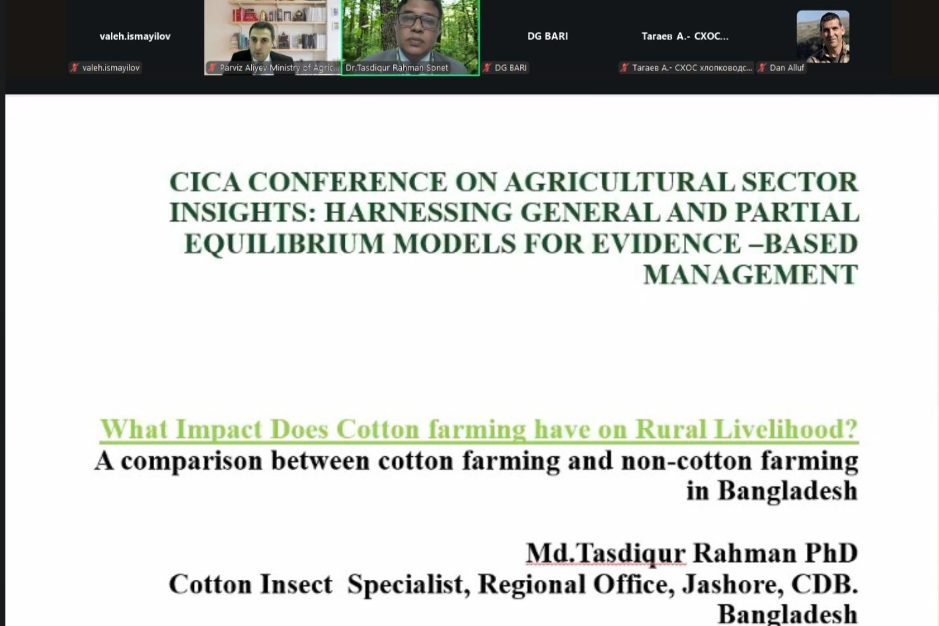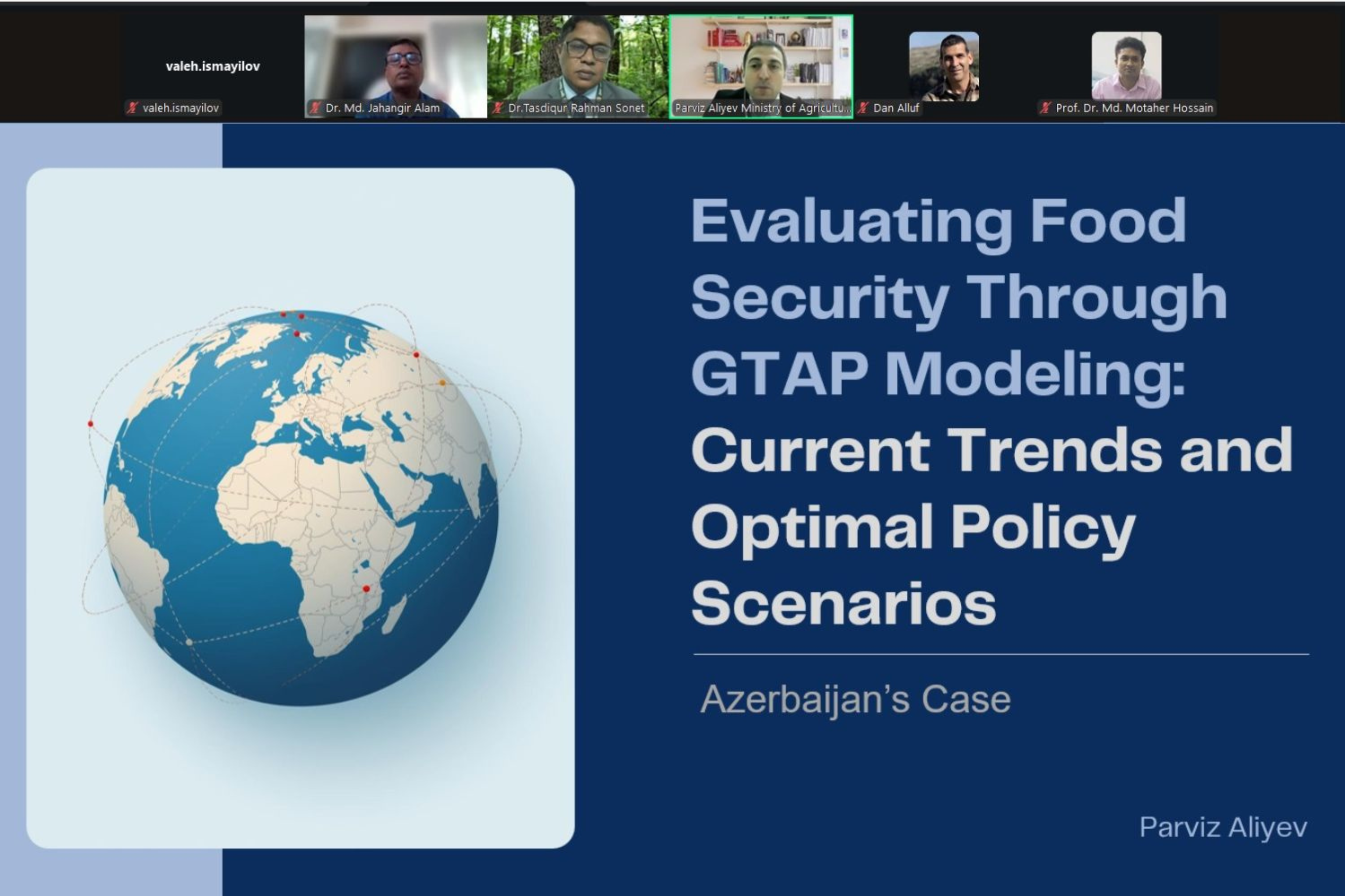 Aqrar Tədqiqatlar Mərkəzinin direktorunun müşaviri Pərviz Əliyev isə “GTAP modeli vasitəsilə ərzaq təhlükəsizliyinin qiymətləndirilməsi: cari trendlər və optimal siyasət ssenariləri” mövzusunda təqdimatla çıxış edib. O, Qlobal Ticarət Təhlili - GTAP modelinin əsas xüsusiyyətləri, komponentləri və tətbiq sahələri barədə danışıb, bu modeldən istifadə etməklə buğdanın idxalının rüsumla tənzimlənməsi ssenarisi üzrə apardığı simulyasiyanın nəticələri barədə məlumat verib.