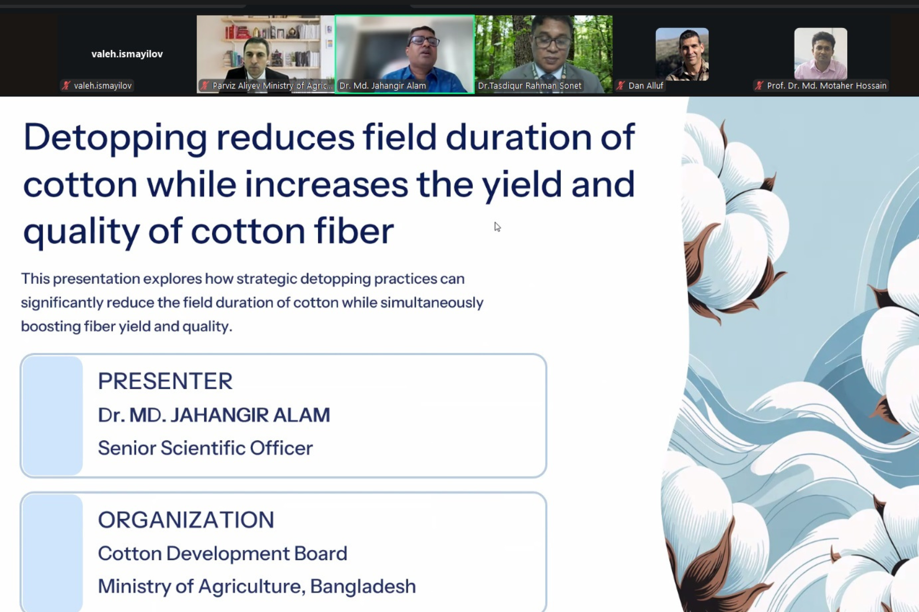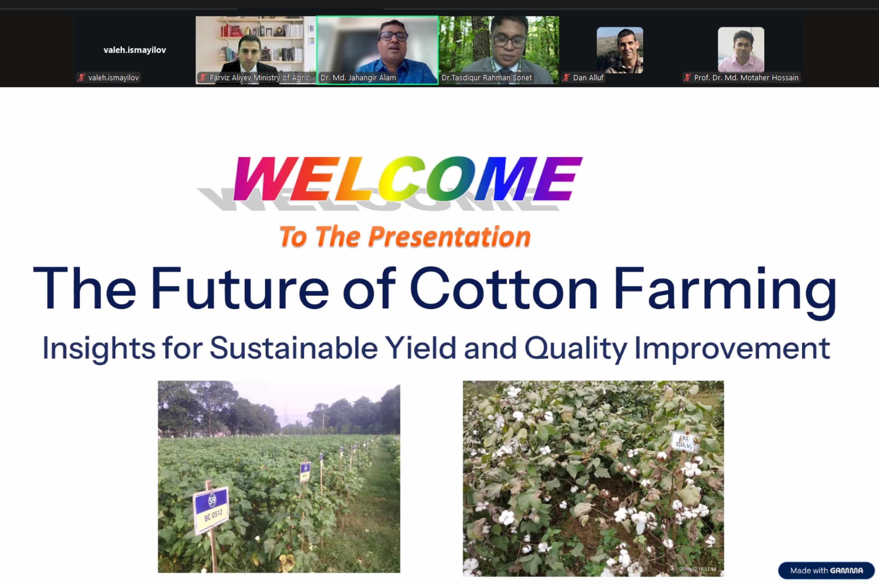 Tədbirdə İsrail və Banqladeşdən olan mütəxəssislər və ekspertlər bitki zərərvericiləri və onlara qarşı müasir mübarizə tədbirləri, pambıqçılığın kənd yerlərinin inkişafına təsiri, aqrar sahədə potensialın gücləndirilməsi, inteqrasiya və kənd təsərrüfatı transformasiyası istiqamətində əməkdaşlıq mövzularında təqdimatlarla çıxış ediblər.