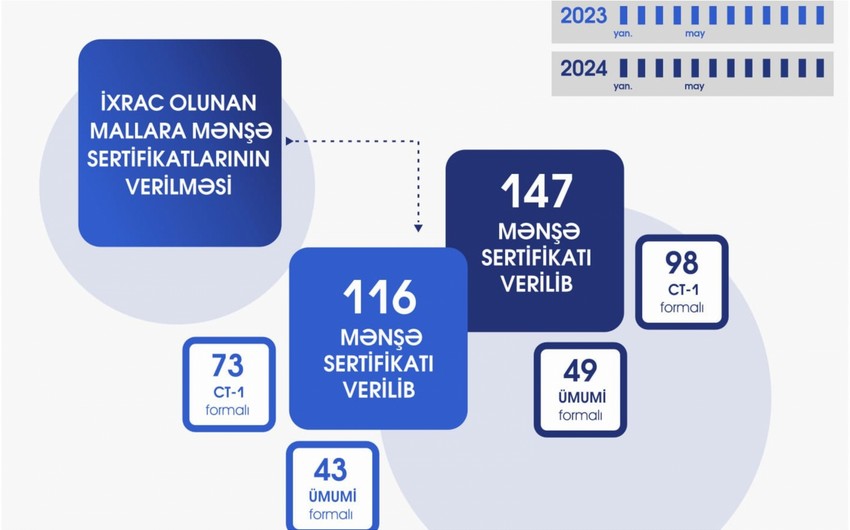 Hesabat dövründə "CT-1" formalı mənşə sertifikatı 98 ədəd, “Ümumi” formalı mənşə sertifikatı 49 ədəd təşkil edib.