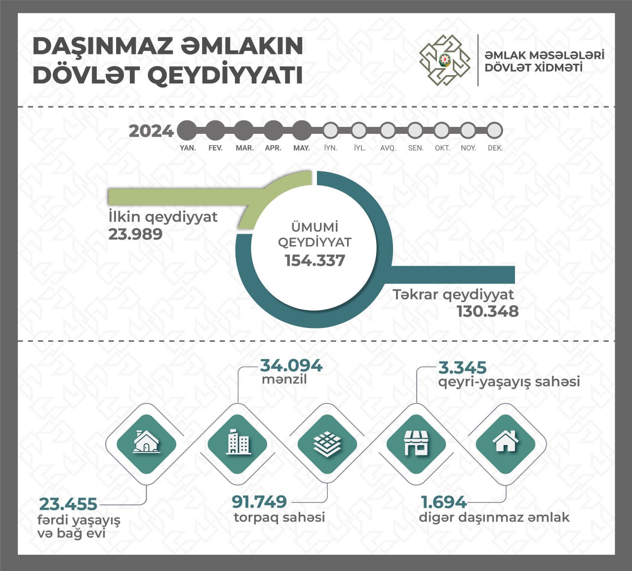 Bu ilin yanvar-may ayları ərzində daşınmaz əmlak üzərində 154 337 mülkiyyət hüququ qeydiyyata alınaraq çıxarışla təmin edilib.