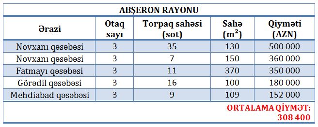Bakı şəhəri Abşeron rayonu üzrə bağ evlərinin bazar qiymətləri açıqlanıb.